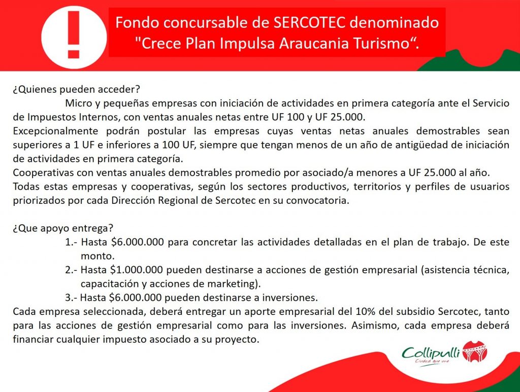 Desde la Oficina Municipal de Microempresas se informa del fondo concursable de SERCOTEC denominado «Crece Plan Impulsa Araucanía Turismo»