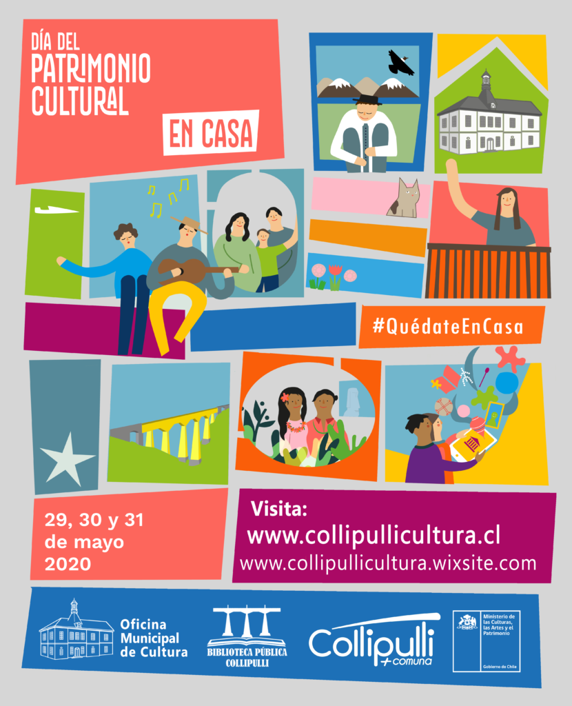 La Municipalidad de Collipulli, a través de su Oficina Municipal de Cultura, se suman a las actividades que realiza el Ministerio de las Culturas, las Artes y el Patrimonio. Para celebrar el “Día del Patrimonio Cultural en Casa” este 29, 30 y 31 de Mayo.